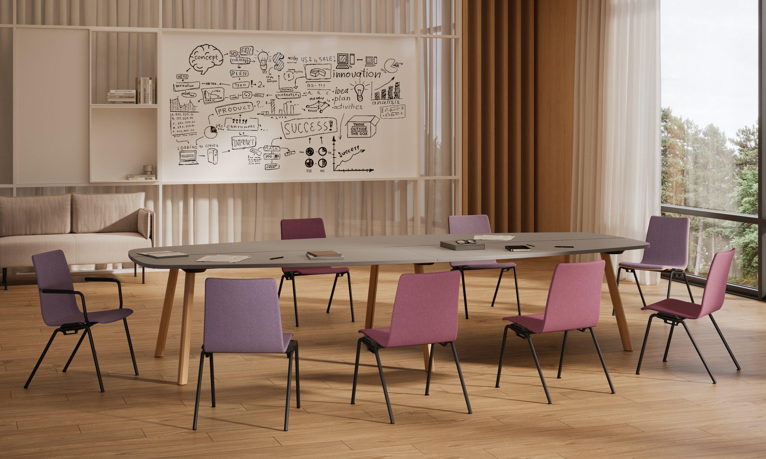 Ümarate servadega Creva pikk koosolekulaud on soliidne, sobitudes hästi mistahes interjööri. Tänu pikale lauaplaadile (3600 mm või 4200 mm) sobib suurte koosolekuruumide sisustamiseks.